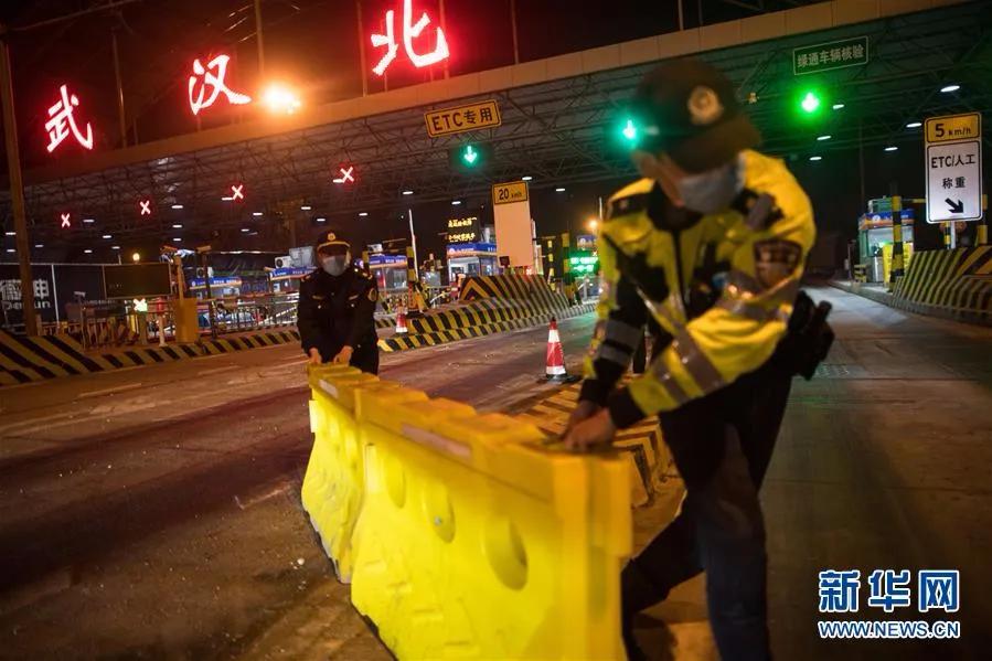 4月8日凌晨,在武汉北高速收费站,工作人员移除围栏。肖艺九 摄