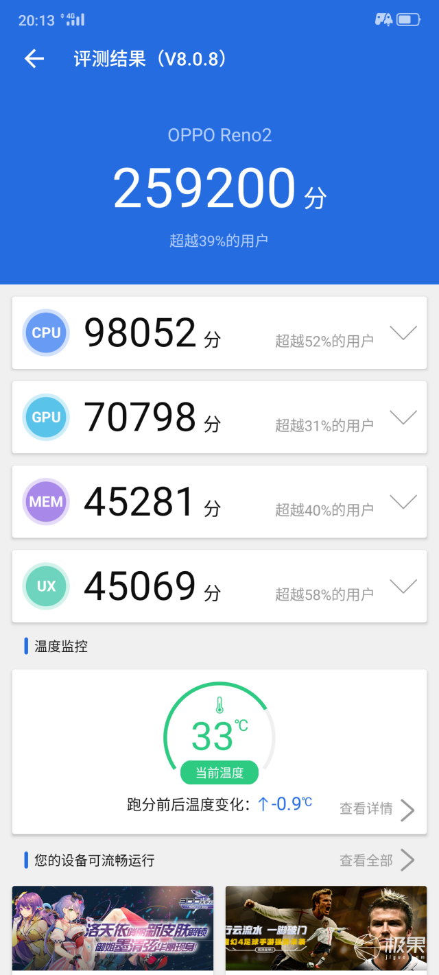 存储容量方面,Reno2目前仅有8+128GB一个版本可选,这一点让极果君有些意外,毕竟一台主打视频拍摄的手机只配128GB的ROM还是有点说不过去的。还是来跑个安兔兔,在最新版安兔兔V8的跑分中,极果君手上这台Reno2跑出了259200的成绩,在中端阵营里属于平均水准,可以满足绝大部分日常使用的需求。
