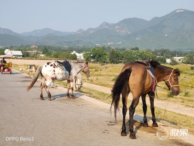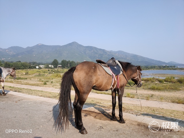 原本极果君打算打道回府,但在天上兜了一圈的果小妞远远地看到水库边上有一群马在吃草。极果君又陷入了思考,如果骑在马背上手持Reno2拍视频又是啥样呢?于是,我们又开始了第二轮测试。福利时间到了!这次换极果君拍果小妞。